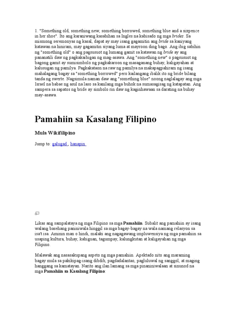 About Press Copyright Contact us Creators Advertise Developers Terms Privacy Policy. Sa makabagong panahon iilan na lamang ang sumusunod rito ngunit sabi ng iba wala naman daw mawawala kung susundin ito. MGA PAMAHIIN AT PANINIWALA SA KASAL Ang lalaking ikakasal ay dapat maunang dumating sa.